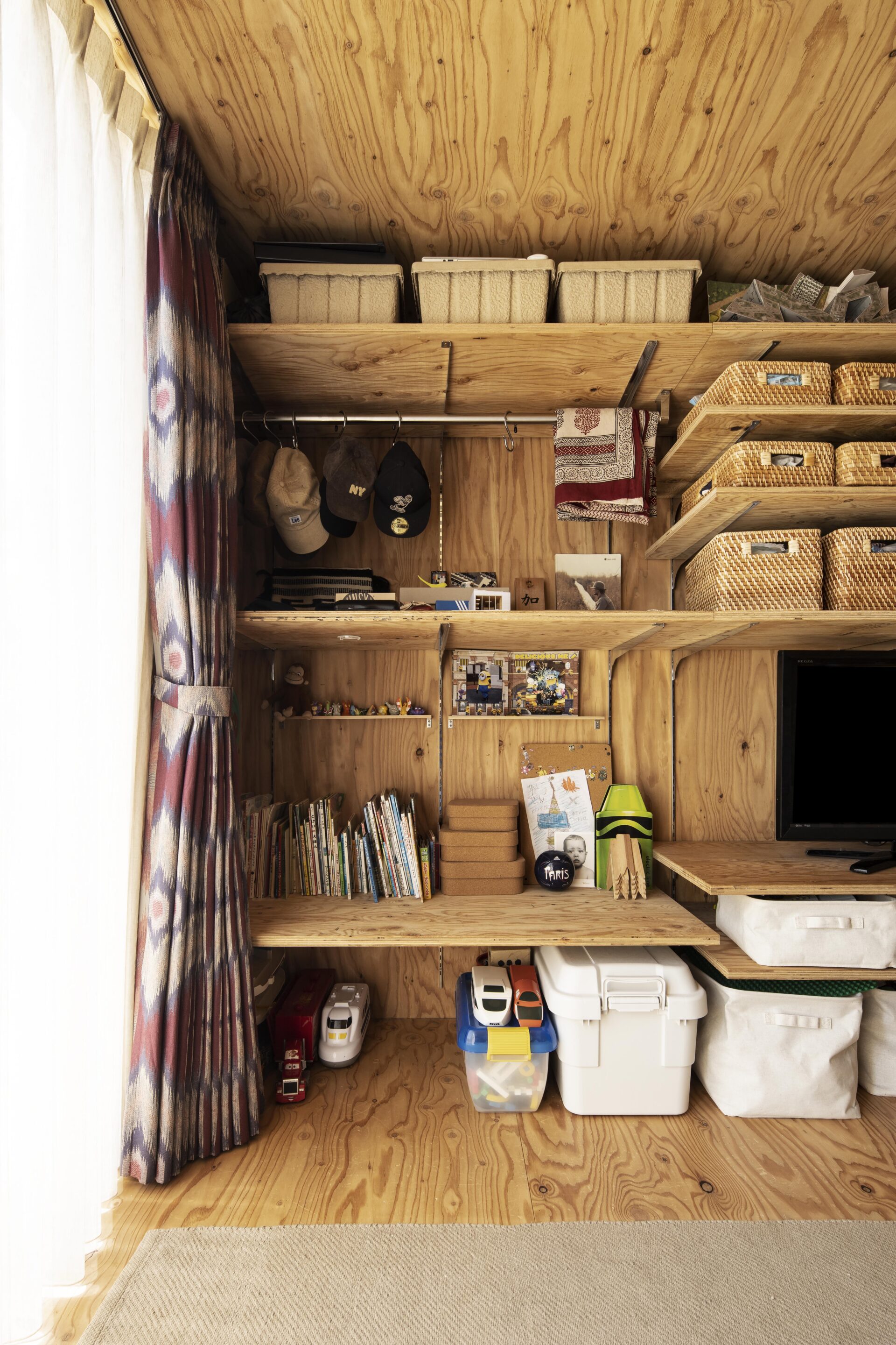 〝絶対決めなければいけないこと以外は決定しない〟という簡易な実験も試みた。全て構造用合板の為、様々なものが後付けで設置可能だ。居住後に「ここに何かほしい」と思えばフックや棚等を取り付けていき、カスタマイズしながら生活をしている。